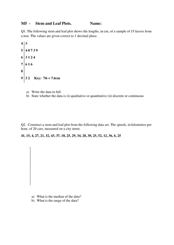 Stem and Leaf Diagram Worksheets | Printable PDF Math Worksheets Printable worksheets on stem and leaf diagrams. Each worksheets is visual, differentiated and fun. Includes a range of useful free teaching resources. Login. Username or Email: Password: ... Stem and Leaf Plots (B) 6; N/A; Stem and Leaf Word Problems: 7 days free trial. Learn with confidence. Stem and Leaf Diagrams Worksheets. | Teaching Resources docx, 90.83 KB KS3-4 (11-16 year olds) Write-on Worksheet split into three sections, reading values from stem and leaf diagrams; drawing stem and leaf diagrams and calculating averages from stem and leaf diagrams. One version has more structure to it. Now also included are versions with the keys on. Creative Commons "Sharealike"