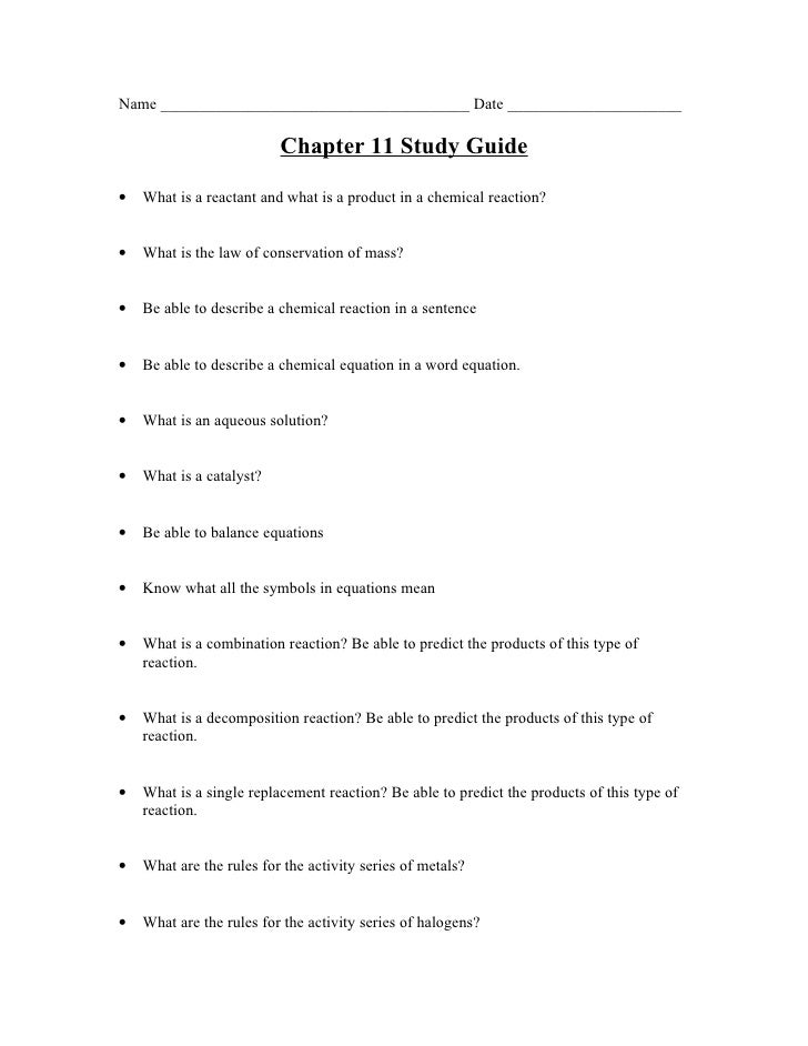 Printable Chemistry Worksheets and Answer Keys, Study Guides ... Chemical Reactions Chemical reaction is a process in which one or more substances, are converted to one or more different products. Synthesis - a chemical reaction where two or more elements or compounds combine to form a single product. Single Replacement Reaction - a chemical reaction where a more active element replaces a less active element ...
