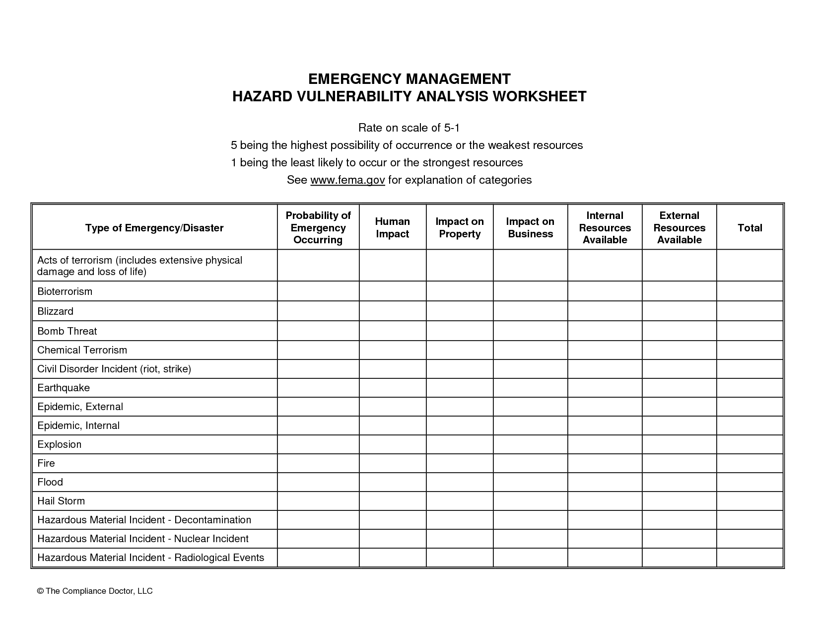 The Disaster Manager's Guide to Hazard Vulnerability Analysis FEMA offers a comprehensive Hazard Vulnerability Analysis Worksheet. This hazard and vulnerability assessment tool can help communities identify risks, address capability gaps, and evaluate preparedness: Identifying and Assessing Risks: Action: Identify threats and hazards of concern and describe their impact.