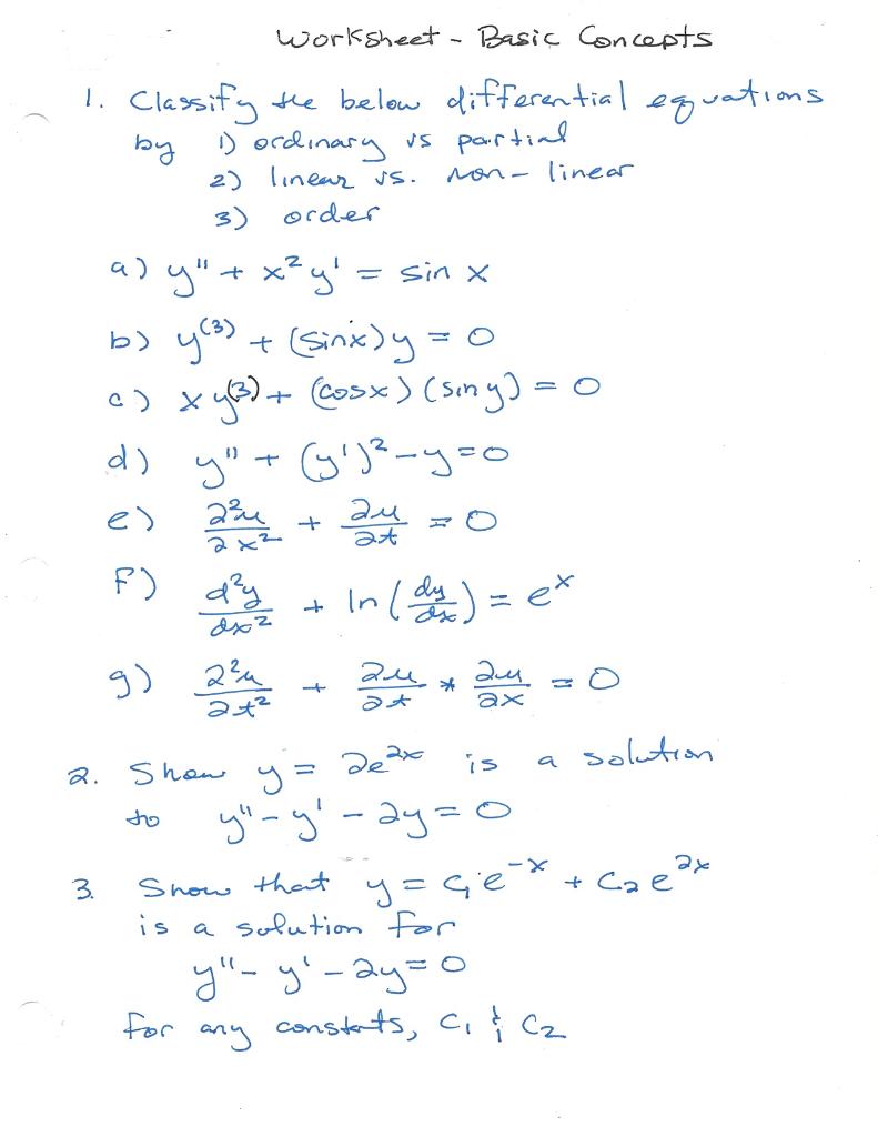 PDF Worksheet 6: 10.1-10 - University of California, Berkeley Worksheet 6: 10.1-10.4 This worksheet is about solving ordinary di erential equations (or ODEs). An ODE for an unknown function y(x) of a variable x is an equation that y satis es in terms of y and its derivatives y0;y00etc. An example of a di erential equation is y00= x+ ex A solution y(x) of an ODE is a function y that satis es the equation. Differential Equations: Problems with Solutions Differential Equations: Problems with Solutions By Prof. Hernando Guzman Jaimes (University of Zulia - Maracaibo, Venezuela) PDF Differential equations questions and answers pdf 84 plus quadratic equation program free McDougal Littell california algebra 2 answers solve complementary solution homogeneous differential equation solve system of onlinear equations in matlab Algebra Structure and Method Book 1 - Solution Key free TI83 EMULATOR Graphing Linear Equations Worksheets CAT: previous question paper, file Differential Equations Worksheets | Partial Differential Equations | Byju's Differential Equations Worksheets. Differential Equations Worksheets are designed with a vision to improve the mathematical skills of the students who are weak in the chapter of Differential Equations. These worksheets cover all the basic concepts of Fractions for the CBSE class 12 students. Ordinary and partial differential equations occur in ...