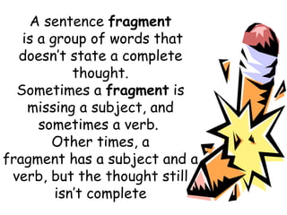 PDF Worksheet 1, Sentence Fragments (7 Exercises) - Grammar Worksheets Teaching Tip: Sentence fragments give students problems because 1) They see fragments in advertisements and published writings, 2) The fragments make sense; they do not obscure the intended meaning, and 3) The fragments seem intuitively right. Impress upon students that in formal, academic writing, sentence fragments should not occur. 2.