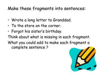 Sentence- Fragment worksheet ID: 1255210 Language: English School subject: Grammar Grade/level: Gr. 1 Age: 5-7 Main content: Sentence and Fragments Other contents: Add to my workbooks (72) Download file pdf Embed in my website or blog Add to Google Classroom