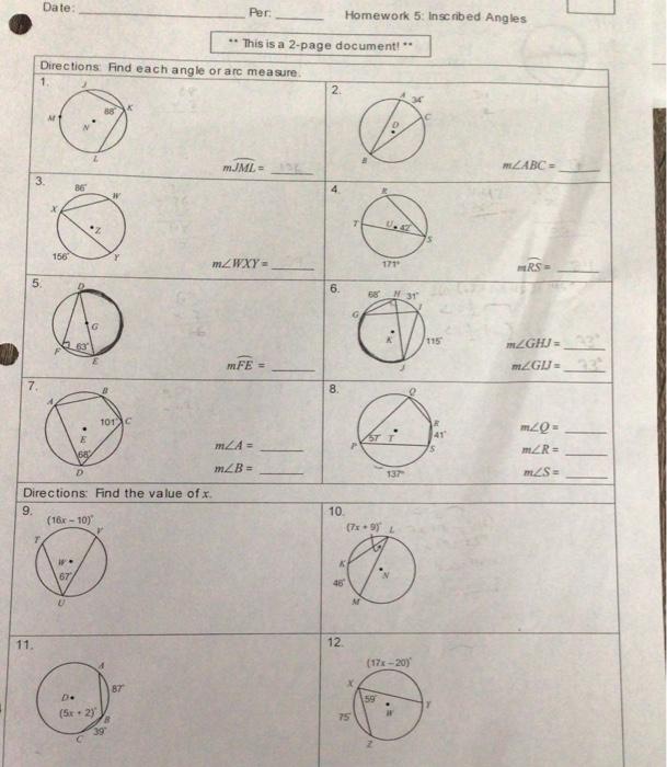 PDF 12-3 Inscribed Angles You can use the Inscribed Angle Theorem to find missing measures in circles. Using the Inscribed Angle Theorem Find the values of a and b. m&PQT=Inscribed Angle Theorem 60 =Substitute. 120 =aSolve for a. m&PRS=Inscribed Angle Theorem b=Arc Addition Postulate =Substitute. b=75Simplify. Find m&PQRif mRS =60. 0 Quick Check1 1 2 (120 1 30) 1 2 PDF Math Worksheet 15) A) 1200 C) 1070 17) 430 C) 410 19) A) 330 C) 380 21) 940 C) 1160 300 B) D) 1490 1500 16) A) 650 C) 470 B) 750 D) 680 1040 B) 1690 D) 1790 2200 B) 210 D) 440 1620 B) 380 D) 550 math-worksheet.org B) D) 1040 B) D) 18) L C) 20) C) 22) C) 1180 1130 1320 300 340 440 390 400 510 230 280 B) 760 D) 1270 Circle puzzle inscribed and central angles answer key This is a 20 question quiz that assesses student understanding of Central and Inscribed Angles in Circles. There is also a fully annotated typed answer key included! Included are: 1) Four questions that ask students identify the angle or arc being created. 2) Four questions asking students to use central angles to find angle or arc measures. Inscribed Angles (examples, solutions, videos, worksheets, games ... Inscribed Angles in Circles - Geometry Help Definition of an inscribed angle, and that the measure of an inscribed angle is equal to ½ the measure of its intercepted arc. Properties of inscribed angles and how to apply them. Show Step-by-step Solutions Central Angles and Inscribed Angles