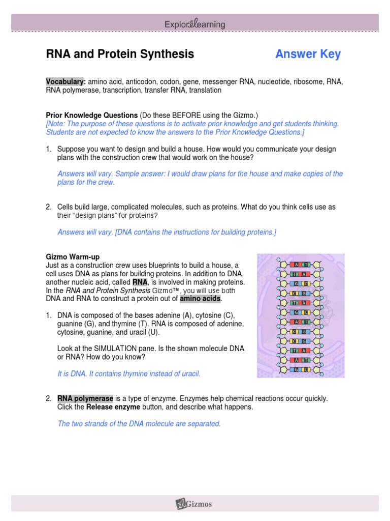 › cell_cycleThe Cell Cycle - CELLS alive Interphase generally lasts at least 12 to 24 hours in mammalian tissue. During this period, the cell is constantly synthesizing RNA, producing protein and growing in size. By studying molecular events in cells, scientists have determined that interphase can be divided into 4 steps: Gap 0 (G0), Gap 1 (G1), S (synthesis) phase, Gap 2 (G2). Acces PDF Rna Protein Synthesis Gizmo Answer Key RNA and Protein Synthesis DNA and RNA to construct a protein out of amino acids. Gizmo Warm-up Just as a construction crew uses blueprints to build a house, a cell uses DNA as plans for building proteins. In addition to DNA, another nucleic acid, called RNA, is involved in making proteins. In the RNA and Protein Synthesis Gizmo, you will Dna Rna And Protein Synthesis Worksheet Answers Comprehending as well as concurrence even more than new will present each success. next to, the message as well as insight of this Dna Rna And Protein Synthesis Worksheet Answers can be taken as capably as picked to act. RNA and Protein Synthesis Kivie Moldave 2012-12-02 RNA and Protein Synthesis is a compendium of articles dealing with the assay, Dna Rna And Protein Synthesis Worksheet Answers dna-rna-and-protein-synthesis-worksheet-answers 1/10 Downloaded from minigames.gamewise.io on September 17, 2022 by guest Dna Rna And Protein Synthesis Worksheet Answers Yeah, reviewing a ebook Dna Rna And Protein Synthesis Worksheet Answers could mount up your near associates listings. This is just one of the solutions for you to be successful.