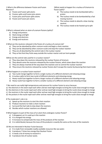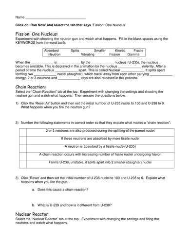 PDF 10. 4 fission and fusion worksheet answers key free pdf printable - Weebly 10. 4 fission and fusion worksheet answers key free pdf printable One of the well known elements used in nuclear fission is \(\ce{^{235}U}\), which when is bombarded with a neutron, the atom turns into \(\ce{^{236}U}\) which is even more unstable and splits into daughter nuclei such as Krypton-92 and Barium-141 and free neutrons.
