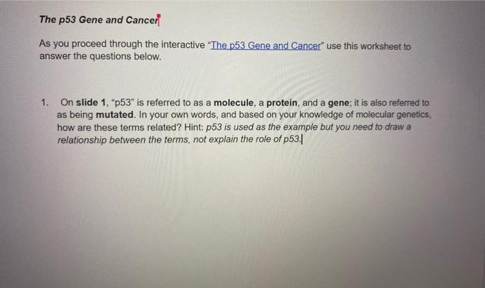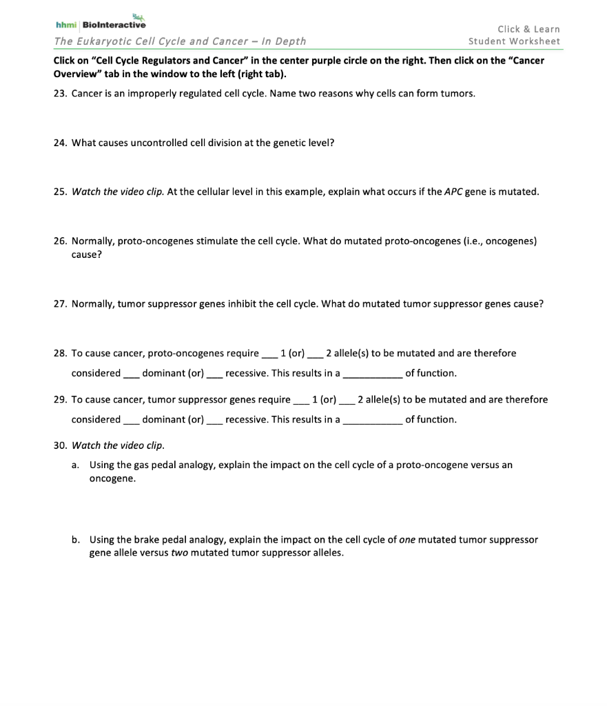 The p53 gene and cancer student worksheet answers. p53_Worksheet_Overview_Final.pdf - Click and Learn The p53... Click and Learn The p53 Gene and Cancer Student. ... instructions as you proceed through the Click and Learn and answer the questions in thespaces below.1. The Eukaryotic Cell Cycle and Cancer - HHMI BioInteractive Sep 03, 2021 · The accompanying worksheets guide students’ exploration. The “Overview Worksheet” is intended to provide an introduction to the cell cycle as it relates to cancer. For a more comprehensive review of the cell cycle and the molecules that regulate each phase, use the “In-Depth Worksheet.” Mitosis and Meiosis Lab - PRE-LAB QUESTIONS What are ... Cancer is a disease related to uncontrolled cell division. Investigate two known causes for cancer and use this knowledge to invent a drug that would prevent the growth of cancer cells. a. A known cause is mutation for cancerous cells that can result in the cell becoming overwhelmed with toxins due to a poor ATP generation. The p53 gene and cancer Flashcards - Quizlet Once it is activated, it can bind to a specific sequence of DNA to activate a particular gene. The genes that p53 activates in turn control many functions, ...