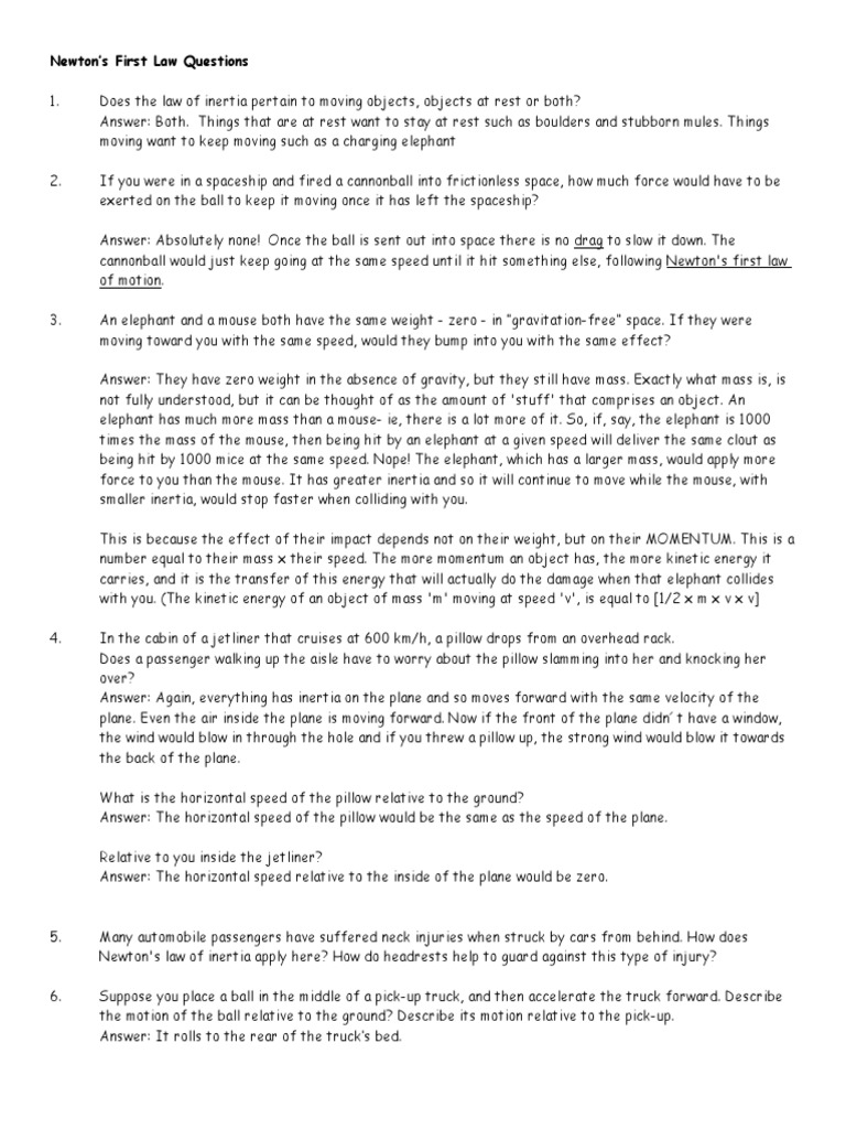PDF Newton'S First Law Conceptual Worksheet NEWTON'S FIRST LAW 1. If you were in a spaceship and fired a cannonball into space, how much force would have to be exerted on the ball to keep it moving once it has left the spaceship? 2. Many automobile passengers have suffered neck injuries when struck by cars from behind. How does Newton's law of inertia apply here?