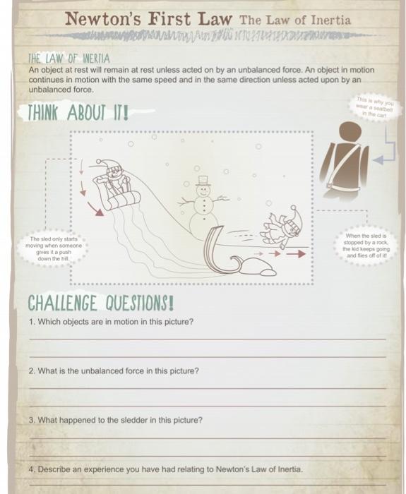 › article › newtons-first-lawNewton's First Law | Worksheet | Education.com Newton’s first law of motion explains that objects in motion stay in motion. Young scientists will learn that this aspect of physical science, also called the law of inertia, is a part of everyday life. Catered to the fifth-grade curriculum, this science worksheet encourages kids to use their new knowledge to answer short challenge questions.