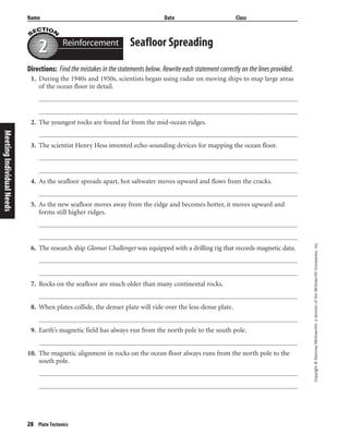 Sea Floor Spreading 7-2 Answer Section Seafloor spreading occurs because ____. a. new material is being added to the asthenosphere. b. earthquakes break apart the ocean floor. c. Seafloor Spreading and Plate Tectonics - Answer Key - Google Docs Seafloor spreading is happening at B. Molten rock pushes up from the asthenosphere and pushes the plates apart at the mid-ocean ridge. This creates new ocean ... sea_floor_spreading_worksheet (1).pdf - Name_ Sea Floor... Name________________________________Sea Floor Spreading WorksheetUse the figure above to answer the following questions.1) What feature of the ocean floor is ...
