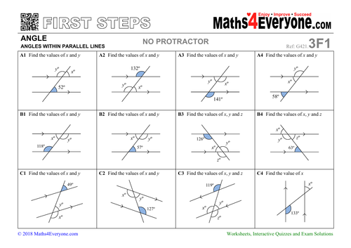 Angles in Parallel Lines - GCSE Maths - Steps, Examples ... To do this, we use three facts about angles in parallel lines: Alternate angles, co-Interior angles, and corresponding angles. Properties of parallel lines. Alternate angles are equal: Sometimes called ‘Z angles’. Corresponding angles are equal: Sometimes called ‘F angles’ Co-interior angles add up to 180^o: Sometimes called ‘C angles’. Angles in Parallel Lines - Corbettmaths Angles: Parallel Lines. Video 25 on Corbettmaths. Question 3: Find the angle x in each question below. Give reasons for your answer. Lines and Angles Worksheets | Download Worksheet PDF - BYJUS Learn: Lines and Angles. Lines and angles worksheets for class 7 and 9 students are excellent sources who wish to develop and enhance their skills in angles. These worksheets have concepts such as identifying the names of angles, lines, classifying lines and angles, measuring angles and other exciting concepts. Benefits of Practicing Lines and ...