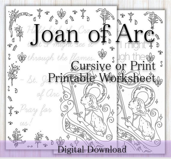 St. Joan of Arc Handwriting and Coloring Page with Print and Cursive Options Featuring Catholic Saint Quote and Prayer for Download, Print