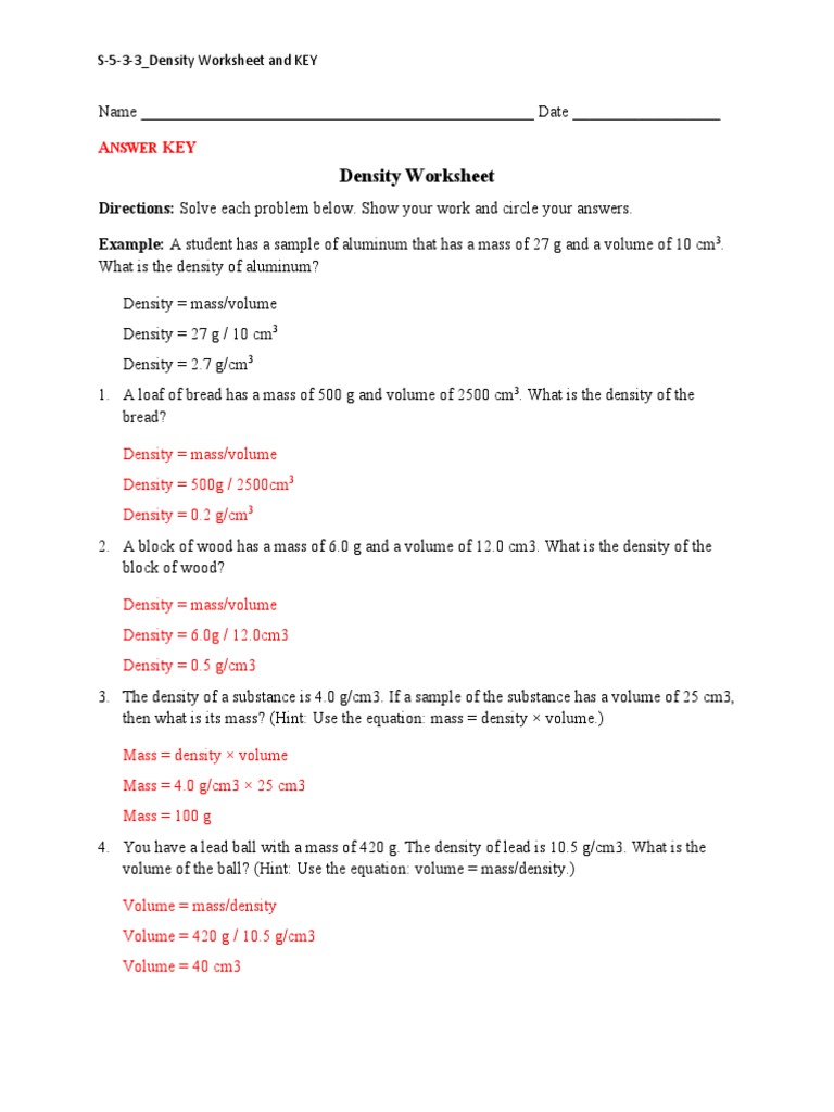 Density Problems - Real World Physics Problems Density Problems. On this page I put together a collection of density problems to help you better understand calculations involving density. Problem # 1. A solid ball has a mass of 50 grams and a volume of 20 cm 3. What is the density? (Answer: 2.5 g/cm 3 ) Problem # 2. A solid ball has a mass of 100 grams and a radius of 2 cm. Density Practice Problem Worksheet - Fallcitylodge.com Name_____ Density Practice Problem Worksheet 1) A block of aluminum occupies a volume of mL and weighs g. The mass is calculated by multiplying the density by the amount. First we have to calculate the amount of the cuboid. Occasionally you may come across other kinds of models corresponding to imperial models just like the cubic foot.