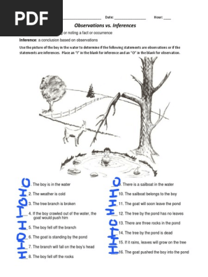 Observations and inferences worksheet. Observation or Inference? observation inference ... Then write three observations and two inferences, based on the picture. 1. (observation) ... WORKSHEET. Science Skills—Observation ... Observations vs Inferences Worksheet | Science process ... - Pinterest Sep 23, 2019 - Observations vs Inferences: Students look at a picture and decide if the given statement is an inference or an observation. Observations and Inference Worksheet - SlideShare Observations and Inference Worksheet: Part 1 Directions: Read the following sentences carefully. Determine if the sentence is an observation, an inferenc… Observations Inferences - Beachwood City Schools your phone is a quantitative observation. Qualitative observations- involve descriptions that cannot be expressed with numbers. Noticing that a bike is blue or ...