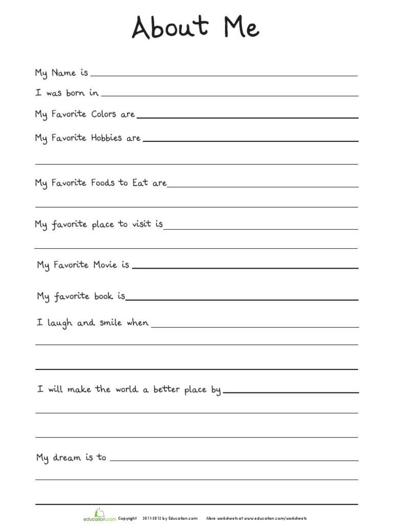 All About Me Worksheets Free Printable For Kindergarten The free all about me worksheet pdf set includes: The All About Me file (see below) Colored copy paper (front page) White copy Paper (inside pages) Pencils and art supplies Printer Stapler All about me PDF Most children in this age group love talking about themselves and their lives.