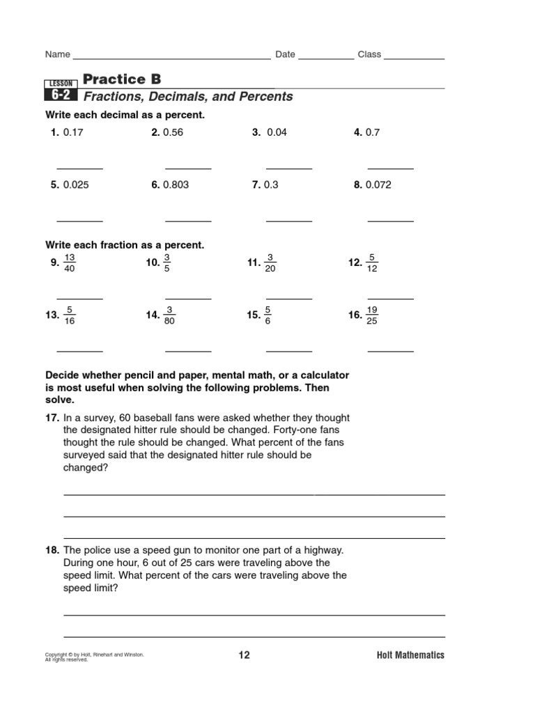 Percent word problems (practice) | Khan Academy Math 6th grade Rates and percentages Percent word problems. Percent word problem: recycling cans. Practice: Percent word problems. Grade 6 Fraction, Decimal & Percentage Worksheets Use these free worksheets during independent math activities. Click on the images below to download the worksheets. $5.00 Fractions, Decimals & Percentages These worksheets have students converting between fractions, decimals and percentages. $5.00 $5.00 $5.00 $13.00 $23.00 $5.00 $5.00 $5.00 $5.00 $5.00 Decimals to Fractions and Percentages Free Fractions, Decimals And Percents Worksheets [PDFs] A free fraction to decimal to percent worksheet is designed to deepen kids' familiarity with fractions, decimals, and percentages. With worksheets, students learn to think in new ways by using various strategies to answer the problems. Kids will encounter questions where they will have to solve problems that require them to compare and ...