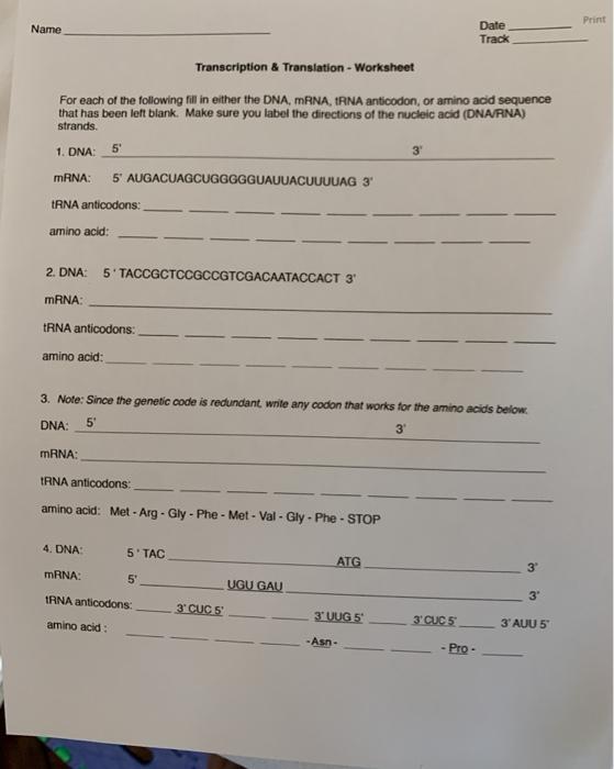 Dna and rna transcription and translation worksheet answers