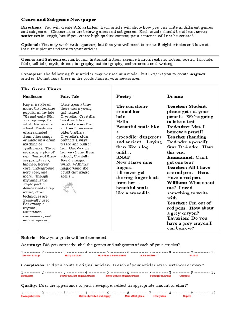 PDF Genre and Subgenre Worksheet 6 - ereadingworksheets.com Genre and Subgenre Worksheet 6 Directions: Read the descriptions of the texts. Look for details that reveal the genre. Write the genre and subgenre on the lines and write a sentence explaining your answer. 1. Live Wire by Chris Crispin Chris Crispin served in the military field of Improvised Explosive Device Disposal during the Iraq War. Genre And Subgenre Worksheet | Teachers Pay Teachers Browse genre and subgenre worksheet resources on Teachers Pay Teachers, a marketplace trusted by millions of teachers for original educational resources. genre-assignment.docx - Name: _Heaven Thomas_ Genre and Subgenre ... View genre-assignment.docx from ECON 212 at Trinity Washington University. Name: _Heaven Thomas_ Genre and Subgenre Worksheet 6 Directions: Read the descriptions of the texts. Look for details that