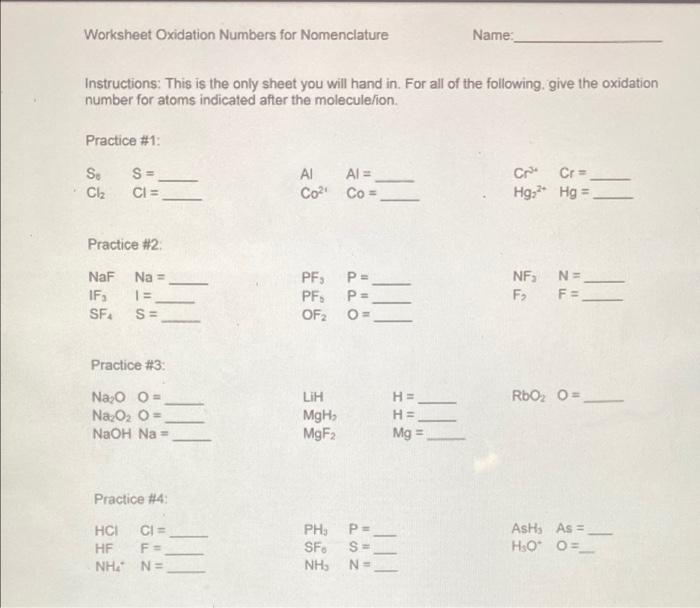 Oxidation Numbers Exercise Answers - Multidict net Oxidation Number Exercise - answers ... Do not hand in this work sheet. ... Similarly, the oxidation numbers for all the atoms of an ion must add up to the. ASSIGNING OXIDATION NUMBERS WORKSHEET - TSFX In the following questions, give the oxidation number of the indicated atoms/ion. 1. N in N2O3. ______. 2. S in H2SO4. ______. 3. C. ______. Oxidation Number Worksheets Answer Keys Directions: Use the Rules for Assigning Oxidation Numbers to determine the oxidation number assigned to each element in each of the given chemical formulas.