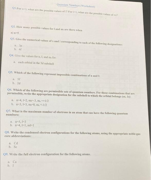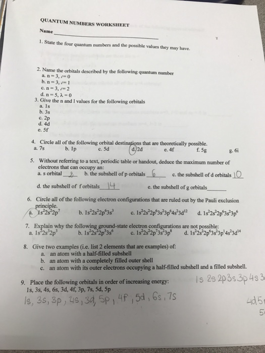 PDF QUANTUM NUMBERS WORKSHEET - lee.k12.nc.us QUANTUM NUMBERS WORKSHEET Name _____ 1. State the four quantum numbers and the possible values they may have. 2. Name the orbitals described by the following quantum numbers a. n = 3, L = 0 b. n = 3, L = 1 c. n = 3, L = 2 d. n = 5, L = 0 3. Give the n and L values for the following orbitals a. 1s b. 3s c. 2p d. 4d e. 5f