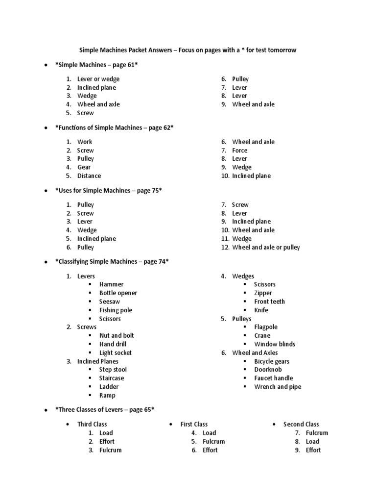 FREE Simple Machines Worksheets - 123 Homeschool 4 Me These no-prep, free printable simple machines worksheets are a handy way to review what students have learned. Use these simple machines worksheet pages to review and assess what kindergarten, first grade, 2nd grade, 3rd grade, 4th grade, 5th grade, and 6th grade students have learned. There are various different choices of simple machine ... Simple Machines - Super Teacher Worksheets Simple Machines Printable worksheets and activities to teach students about the six types of simple machines: inclined plane, wedge, wheel and axle, screw, lever, and pulley. Simple Machines: Mini-Book FREE An 8-page mini book that teaches students about simple machines 3rd through 5th Grades View PDF Identifying Simple Machines FREE worksheet packet simple machines Bill Nye the Science Guy : SIMPLE MACHINES (STEM video worksheet). 15 Images about Bill Nye the Science Guy : SIMPLE MACHINES (STEM video worksheet) : Simple Machines Packet (About 30 pages) - Homeschool Den, Simple Machines Packet (About 30 pages) - Homeschool Den and also Bill Nye Simple Machines worksheet physics Jr High middle school TX TEKS. Answers to 8th grade Simple Machines Worksheet Packet.docx... Simple Machines Packet Answers - Focus on pages with a * for test tomorrow *Simple Machines - page 61* 1. Lever or wedge 2. Inclined plane 3. Wedge 4. Wheel and axle 5. Screw 6. Pulley 7. Lever 8. Lever 9. Wheel and axle *Functions of Simple Machines - page 62* 1. Work 2. Screw 3. Pulley 4. Gear 5. Distance 6. Wheel and axle 7. Force 8.