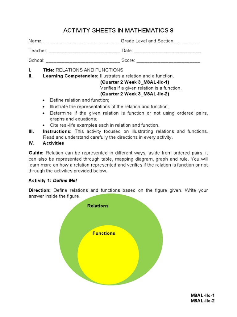 2.1: Relations and Functions - Mathematics LibreTexts A function is a relation that assigns to each element in its domain exactly one element in the range. For each ordered pair in the relation, each x -value is matched with only one y -value. Definition: Function A function is a relation that assigns to each element in its domain exactly one element in the range. Graphing Square Root Functions Worksheet Algebra 2 Students will use graphing functions worksheets to compare data and solve problems. Students will also be taught about different types of graphs. Some worksheets focus on graphing inverse functions and inverse relations. One worksheet may show the graphs for a function while another shows graphs for a function and its inverse. Function Notation Worksheet Algebra 2 - blissinspire All worksheets created with infinite algebra 2. Infinite algebra 2 function notation created date. This is a double sided practice page over functions domain range and function notation meant to provide comprehensive practice for the algebra 2 student. Algebra 2 Parent Functions And Transformations Worksheet Inverses Of Relations And Functions Worksheet (PDF) - thesource2.metro Relations And Functions Worksheet is genial in our digital library an online access to it is set as public consequently you can download it instantly. Our digital ... Reveal Algebra 2 MCGRAW-HILL EDUCATION. 2020 High school algebra, grades 9-12. Magnalia Christi Americana Cotton Mather 1853 Modeling, Functions, and Graphs Katherine Yoshiwara ...