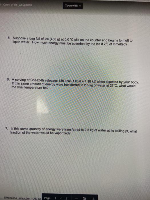 Unit 3 ws-3 | PDF - Scribd date pa unit 3 worksheet 3 — quantitative energy problems energy constants (h20) neat oe | 334 j/g heat of fusion (melting or freezing) hg 7" lenaas 2260 jig heat of vaporization (evaporating or condensing) hy iq) © s 2.1dig'c heat capacity (¢) of solid water 4.18 j/g" heat capacity (c) of liquid water for each of the problems sketch a …
