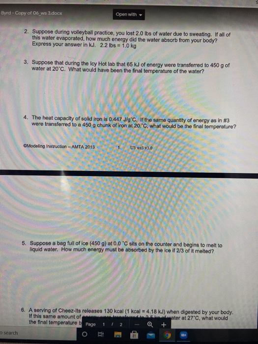 Unit 3 Worksheet 3 Quantitative Energy Problems Answer Key Unit 3 Worksheet 3 Quantitative Energy Problems Part 1 . Energy constants (H2O) 334 J/g Heat of fusion (melting or freezing) Hf ... Express your answer in kJ. 2.2 lbs = 1.0 kg . 3. Suppose that during the Icy Hot lab that 65 kJ of energy were transferred to 450 g ... 4. The heat capacity of solid iron is 0.447 J/g˚C. If the same quantity of ...