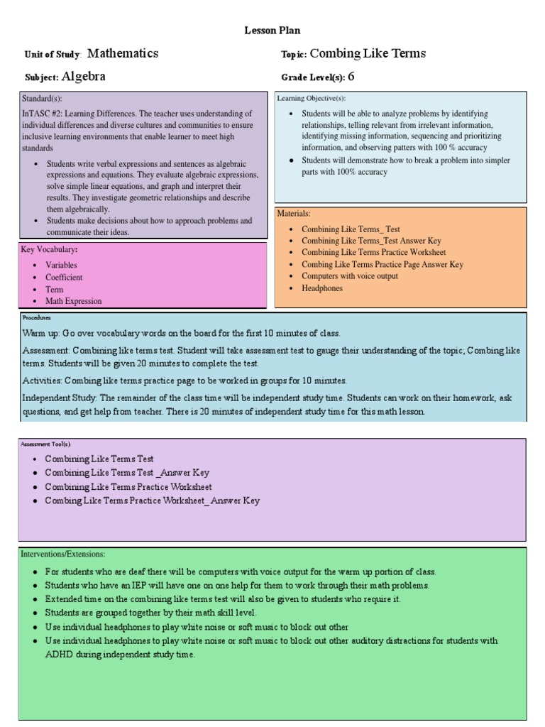 Combining Like Terms Worksheet Teaching Resources | TPT Results 1 - 24 of 281 ... Worksheet with answer key to practice combining like terms or simplifying variable expressions. If you enjoy please check out some of ... Free worksheets for simplifying algebraic expressions Create free worksheets for simplifying expressions (pre-algebra / algebra 1), ... The expressions include ones where you need to combine like terms (such as ... Combining Like Terms Practice - Live Worksheets Combining Like Terms online worksheet for 7-12. You can do the exercises online or download the worksheet as pdf.