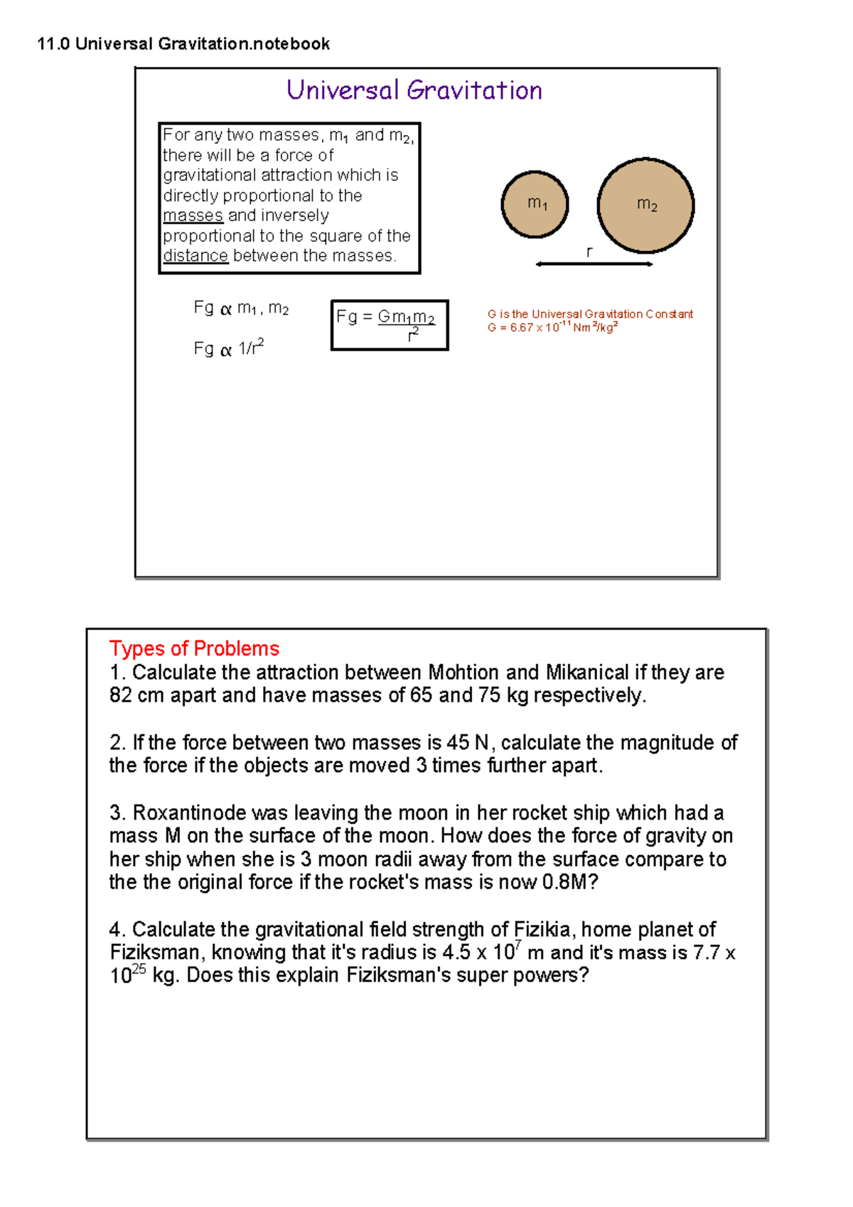Drawing Free-Body Diagrams - Physics Classroom WebAnswers. Answers to the above exercise are shown here. If you have difficulty drawing free-body diagrams, then you ought to be concerned. Continue to review the the list of forces and their description and this page in order to gain a comfort with constructing free-body diagrams. 1. A book is at rest on a tabletop. Answered: Law of Universal Gravitation… | bartleby Law of Universal Gravitation (continued) has a states that any two objects with mass exert a gravitational force on each other. The force has the same magnitude on each object. The magnitude is directly proportional to the product of the objects' masses. It is inversely proportional to the square of the distance between the objects.