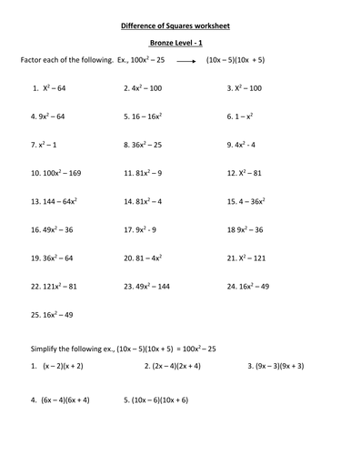 Difference of Perfect Squares Worksheets - Math Worksheets Center In other words, to factor the difference between two perfect squares, then the sum and difference of the two square roots factor the binomial. For instance, you are given the problem of 9x 2 -16, now you need to find the difference in the perfect square. The first step is to find the square root of each function, which is the 3x and 4. Difference of squares - worksheets | Teaching Resources File previews. This file consists of four worksheets at four levels - bronze, silver, gold and challenge. The BRONZE level worksheets, consists of questions that only evaluates questions that involve difference of squares, there is no common factoring or simplifying like terms. The SILVER level worksheet consists of simple difference of squares ...