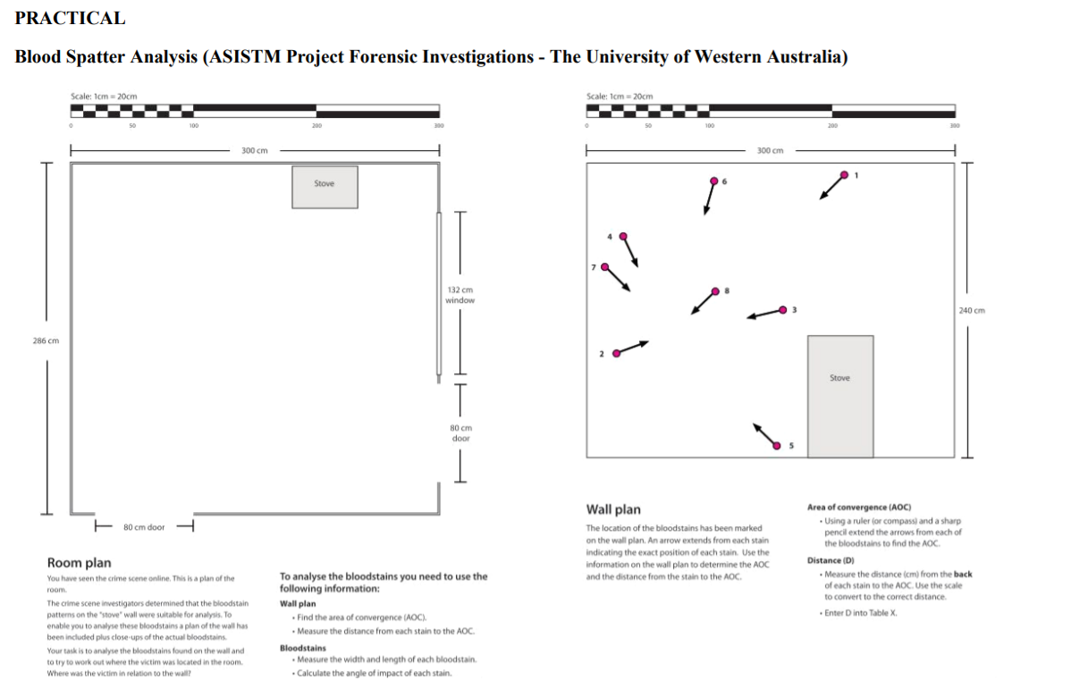 Forensic science blood spatter worksheet. Forensic Files: Past Lives ANSWER KEY Part 1 - Pause the video at … WebCheck out the ’Forensic Files’ …Case study worksheet wednesday (9/13) obj: Worksheet and answer key comes as both pdf and editable.docx file.* it also includes Forensic science is the application of science (chemistry, physics, and biology) to the criminal and civil laws that are enforced by police agencies in a criminal justice system.T ... forensics_blood_spatter_vocabulary_worksheet_student_version_part_2 (2 ... View forensics_blood_spatter_vocabulary_worksheet_student_version_part_2 (2).docx from BIOLOGY 1500 at Andress H S. FORENSIC SCIENCE BLOOD SPATTER VOCABULARY TERMS ... Forensics: Blood and Blood Spatter Review Worksheet Genes. - Our blood type is determined by these, which are inherited from our parents. Hemoglobin. - Protein found in red blood cells that carries oxygen. LCV. - Test used at a crime scene to enhance a bloodstain to make it more visible in photographs. Luminol. - Used by Investigators to detect the presence of blood. PDF BLOODSTAIN PATTERN ANALYSIS DESCRIPTION OF SESSION ... - Exploring Identify the mechanisms by which blood spatter patterns are created. ... Bloodstain pattern analysis is a discipline of forensic science that examines bloodstain patterns at crime scenes. The size, shape, and distribution of bloodstains are ... review the worksheet with participants using the Impact Angle Determination Practice answer key.