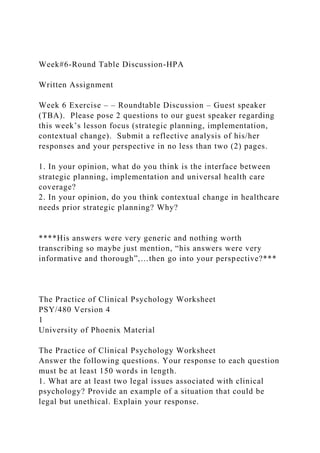 psy480_r3_practice_clinical_psychology - The Practice of... The Practice of Clinical Psychology Worksheet PSY/480 Version 3 1 University of Phoenix Material The Practice of Clinical Psychology Worksheet Answer the following questions. Your response to each question must be at least 150 words in length. .1 What are at least two legal issues associated with clinical psychology?