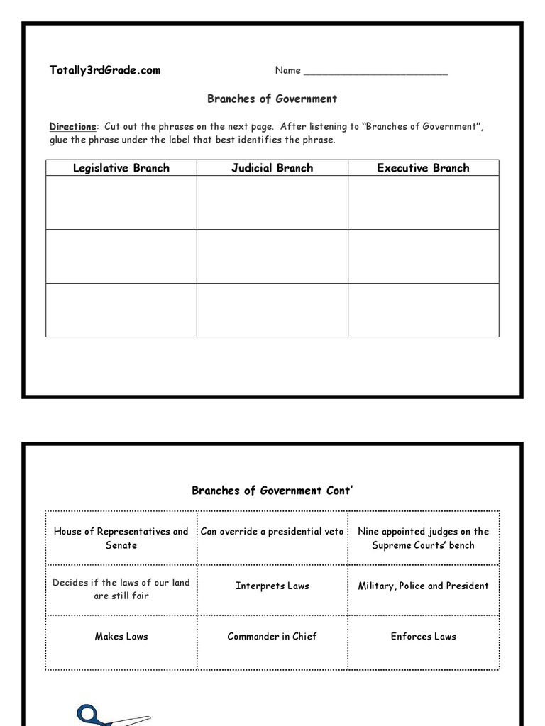 Branches of Government Worksheets - Super Teacher Worksheets Branches of Government Large Tree (Cut, Glue) Cut out the tree trunk, the branches, and the leaves. The branches have the names of government branches on them. The leaves list specific units of government, such as Congress, Vice President, President, Supreme Court, etc. Attach each leaf onto the leaves on the correct branch. 3rd through 5th Grades